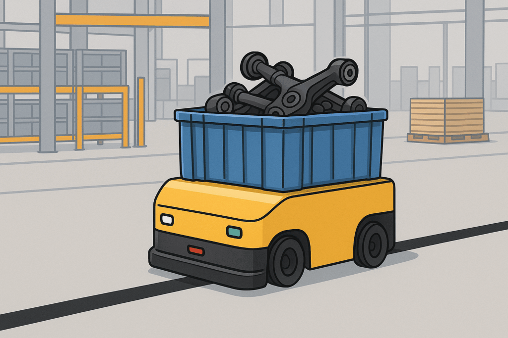 ・牽引型:複数のかご車やパレットを連結して牽引。一度に多くのものを運ぶタイプ
