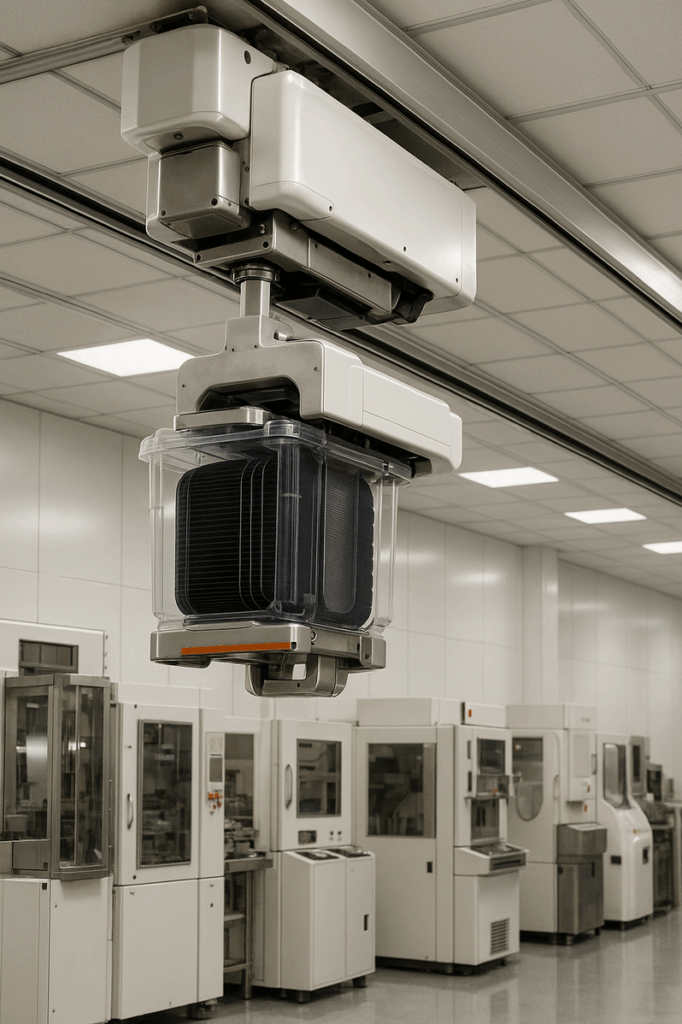 クリーンルーム内の床面は、多数の半導体製造装置で占有されているため、作業スペースが限られます。そこで有効活用されるのが、天井部分の空間です。OHTはこの天井空間を走行ルートとして利用し、FOUPを各装置間へ効率よく搬送する役割を担っています。