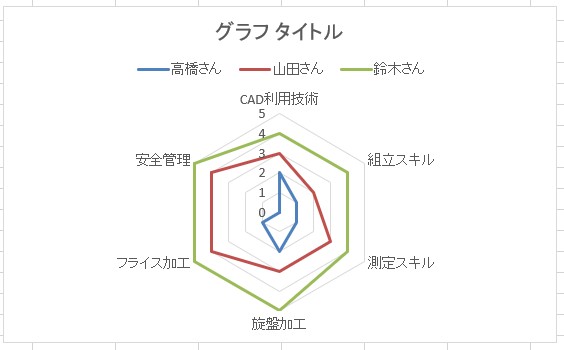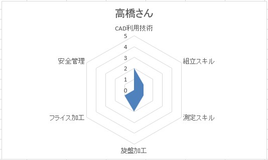 例えば、「製造部 高橋さんのスキルレベル」をレーダーチャートにしたとき、グラフの最大値が高橋さんのスキルレベルの最大値「2」になりました。
