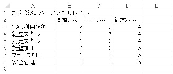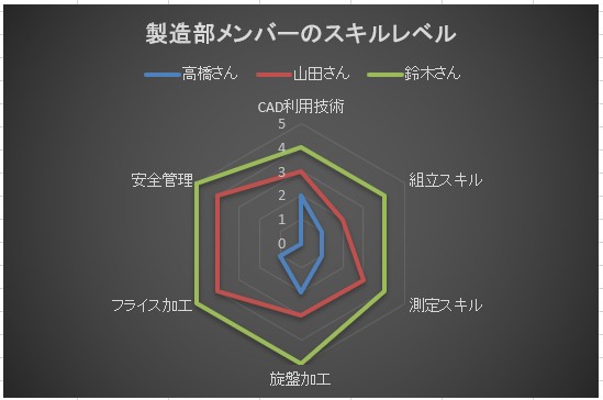 ここから、エクセルを使ったレーダーチャートの作り方を詳しく解説していきます。今回は、「製造部メンバーのスキルレベル」というテーマで作成します。