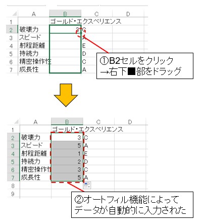 各能力値の隣、B列に設けた空白のセルに、上記の評価を数字に変換したものを入力しましょう。