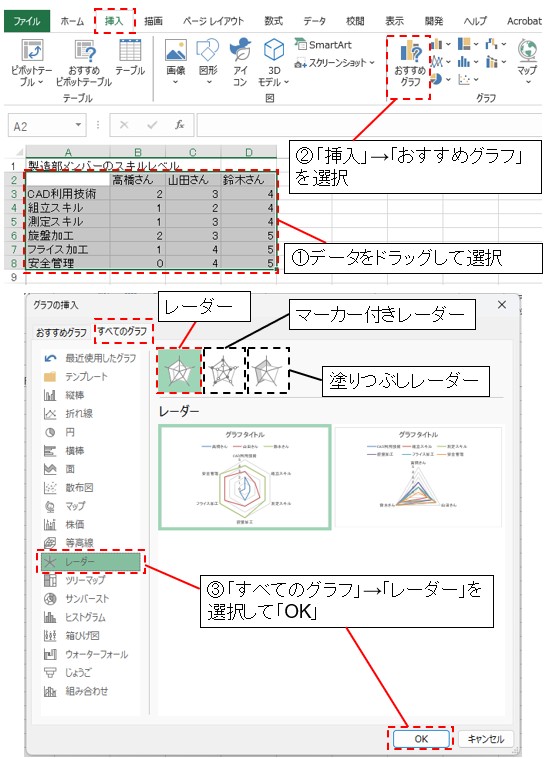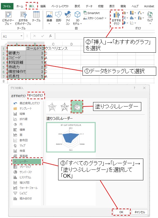 ②エクセル上部メニューの「挿入」→「グラフ」→「おすすめグラフ」→「レーダー」を選択する