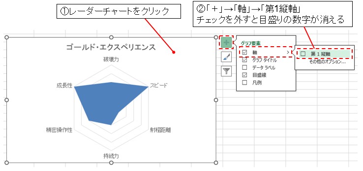 ②「+」→「軸」→「第1縦軸」のチェックを外す