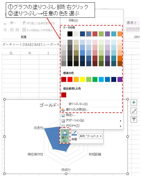 レーダーチャートを塗りつぶしにするには、以下の手順でグラフの種類を変更します。