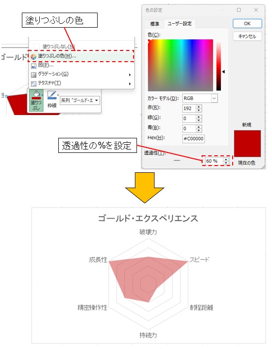レーダーチャートの目盛りが見やすくなるように、グラフの色を半透明に設定します。