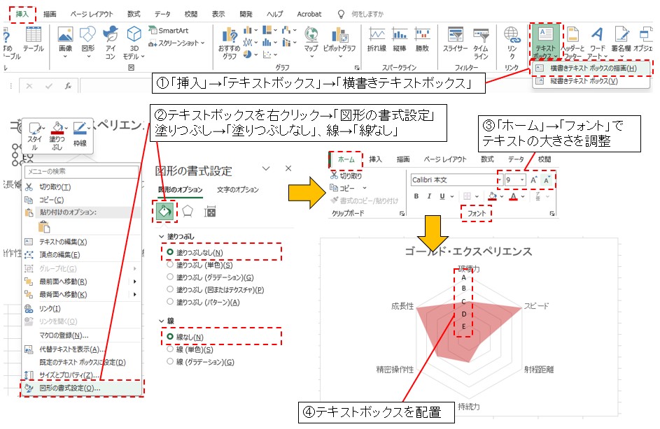 軸に能力値のA~Eを、テキストボックスで追加します。