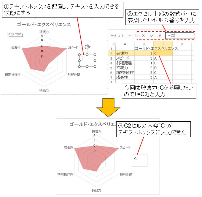 「破壊力:C」「スピード:A」など、各項目の評価が見やすいように、テキストボックスで評価を配置します。