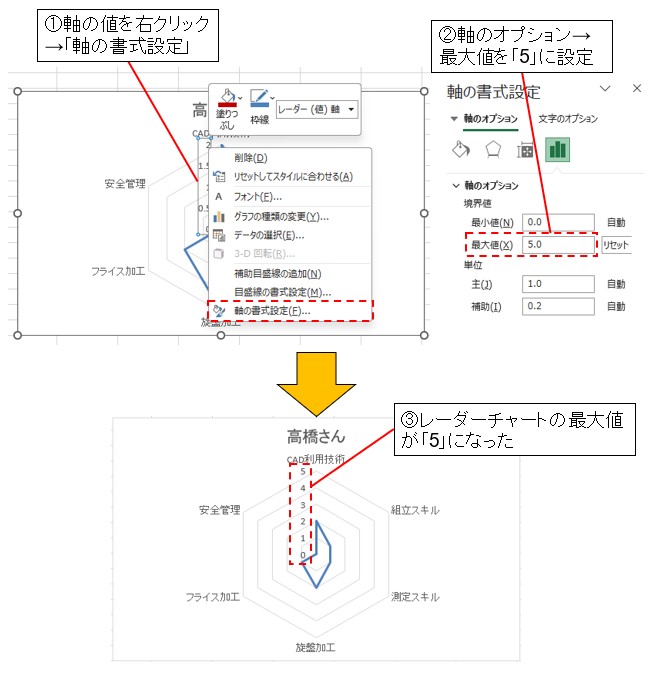 ②軸のオプション→最大値を「5」(スキルレベルの最大値) に設定