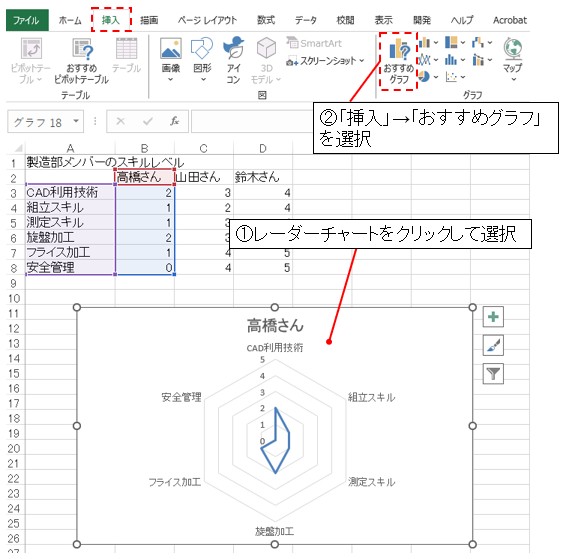 次に、以下の手順でレーダーチャートのグラフを挿入します。