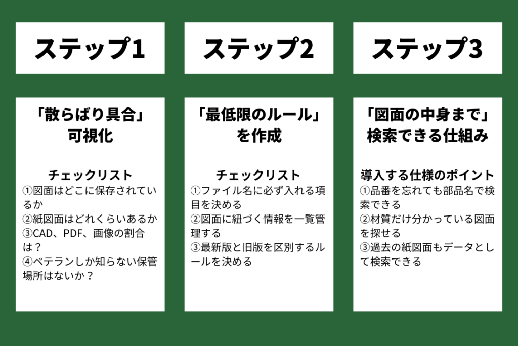この3ステップを進めるだけで、図面探しの時間は大きく減らせます。